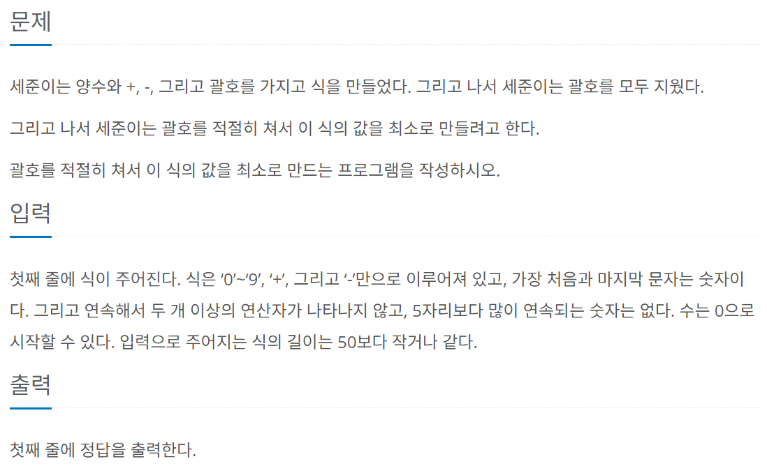 입력받은 식에 임의의 괄호를 넣어 최솟값을 만들려면 - 부호가 나오면 그다음 - 부호가 나오지 전까지 괄호로 묶어버리면 된다