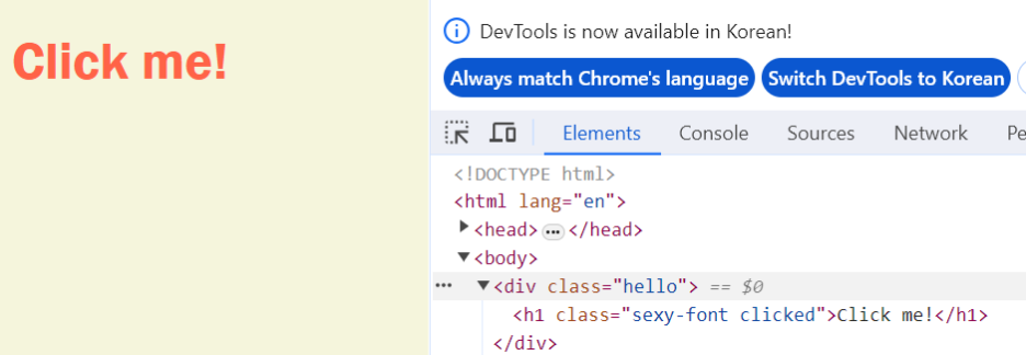 toggle은 h1의 classList에 clicked class가 이미 있는지 확인해서 있으면 toggle이 clicked 제거, 없으면 clicked를 classList에 추가